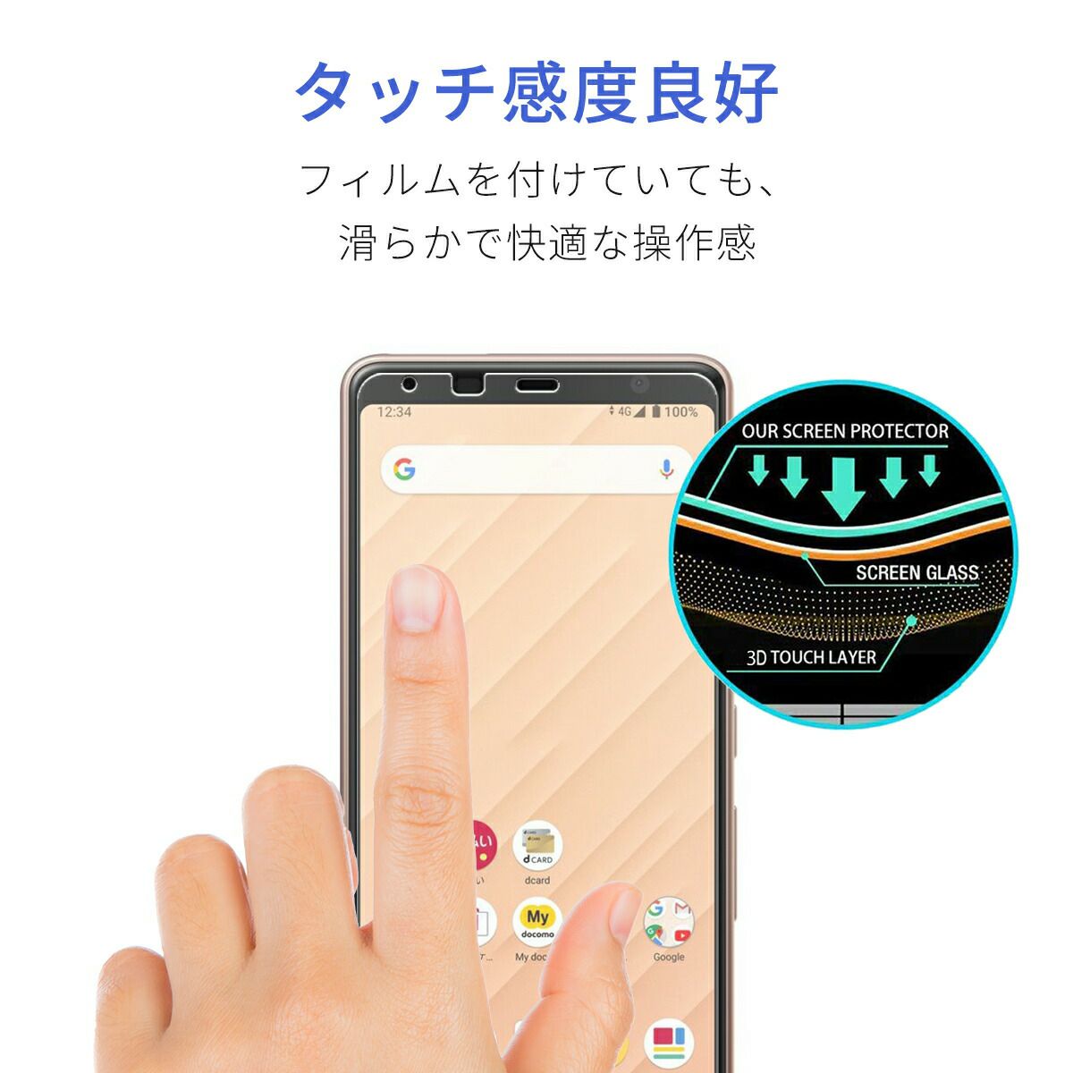 指紋防止 撥油コーティングの特殊加工でスムースタッチも快適に サラサラとした手触りでスマホ操作が可能