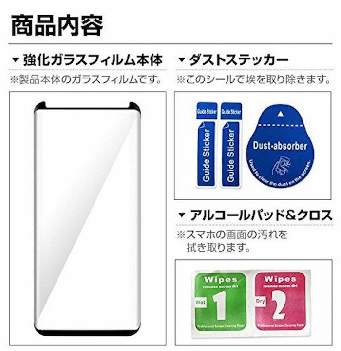 ガラスフィルム1枚 カラー:黒 ウェットクロス 埃取りシールセット