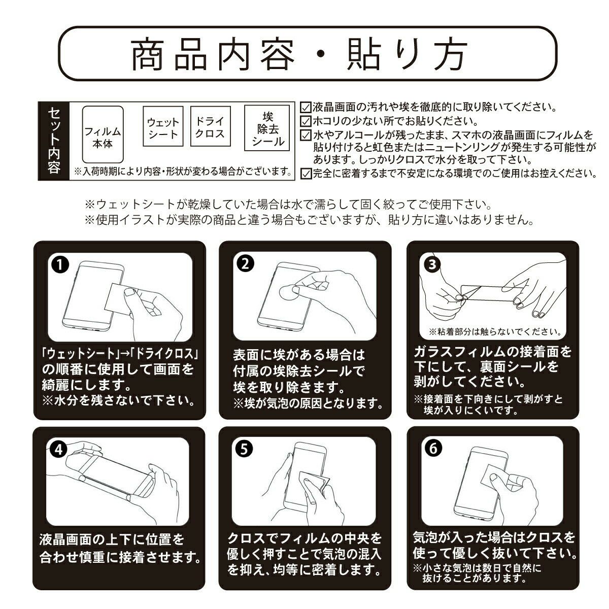 ・水やアルコールが残ったまま、スマホの液晶画面にフィルムを貼り付けると虹色またはニュートンリングが発生する可能性があります。
