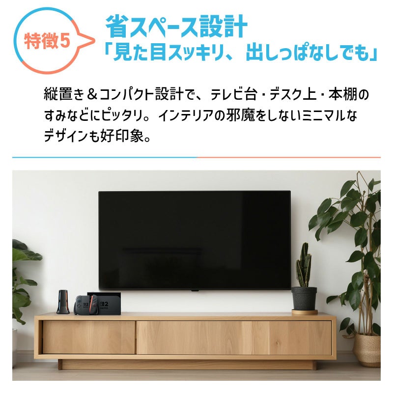 縦型&コンパクト設計で、テレビの横や本棚のすみでもOK。出しっぱなしでも気にならないデザインです。