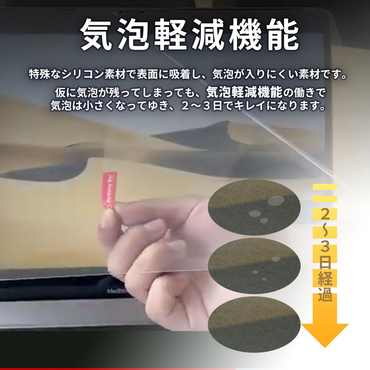| 特殊なシリコン素材で表面に吸い付き、気泡が入りにくい素材です |