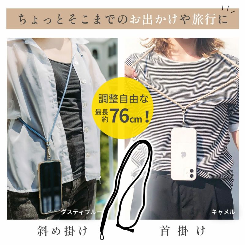 ・肩掛け、首掛け、斜めがけができる最長約76cmのオシャレなロングストラップ。