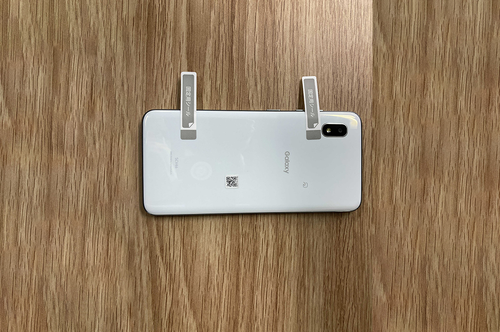 体制が整った上で次に重要なのがスマートフォンの固定です。スマホを裏側に置き、保護フィルムに付属している固定用シールを左右どちらかの上下2箇所に3分の2程度の長さを残して貼り付けます。