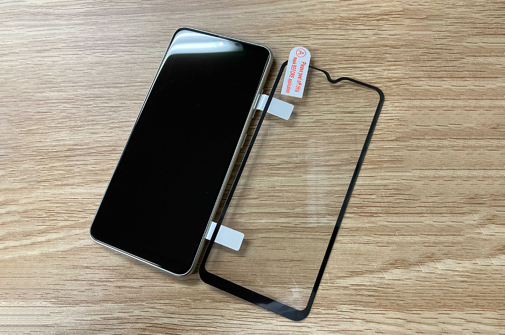 保護フィルムを取り出し、吸着面のシート(セパレーター)を剥がさずに一旦スマホの画面に当て、スピーカーやフロントカメラの位置が保護フィルムと合うように調整します。適切な位置に調整できたら固定用シールを折り返し、保護フィルムの位置がずれないように固定します。